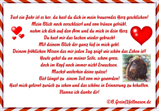 Frauchen ein ganz liebes Gedicht gemacht! Bei Rike habe ich das auch ganz gut geschafft. Man ich kann Euch sagen, dass war ein verdammt hartes Stück Arbeit. Anfangs dachte ich schon ich beisse mir an ihr noch die Zähne aus. Aber wer kann schon auf Dauer wahrem Neuficharme wiederstehen? Eben, sag ich ja! Sie hat es ja auch mittlerweile gelernt und jetzt sind wir immer fleissig am Kuscheln, Toben und unsere Menschen scheuchen, Nur eines muss ich ihr noch abgewöhnen: Das sie mich anknurrt wenn sie ihren blöden Ball in der Schnauze hat und ich zu ihr komme. Als ob ich ihr den klauen würde! Wenn, dann würde ich ihn mir nur mal ausborgen. Aber das werde ich sicher auch noch schaffen. So, nun bin ich müde und werde daher erstmal ein Nickerchen machen. go luath* Eure Flanna *Das ist gälisch und bedeutet „Bis bald“